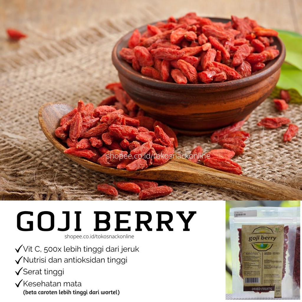 Goji berry mengandung banyak nutrisi antara lain vitamin A vitamin B1 vitamin B2 vitamin C zat besi selenium kalium seng dan tembaga. 5Selain buah beri pucuk dan daun dari tanaman wolfberry muda juga bisa dimakan. Air 90 g protein 39 g lemak 06 g karbohidrat 39 g serat 13 g β-karoten 43 mg vitamin B 1 008 mg vitamin B 2 03 mg niasin 08 mg vitamin C 8 mg Ca 142 mg P 41 mg Fe 52 mg Na 184 mg dan K.